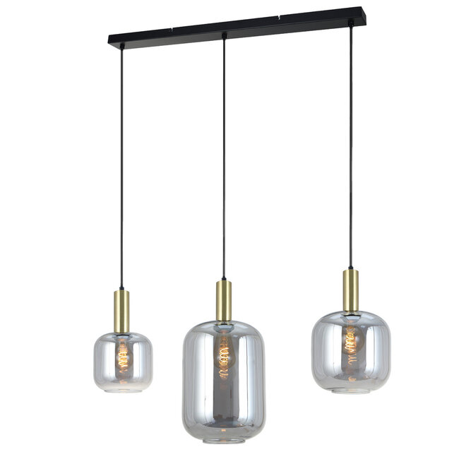 Breng karakter en warmte in je interieur met deze stijlvolle 3-lichts hanglamp, waarin modern design en vintage charme moeiteloos samenkomen. De lamp bestaat uit drie pendels die elegant hangen aan een slanke, rechthoekige plafondplaat in zwart (RAL 9005) met een afmeting van 90 cm lang en 15 cm breed. De pendels zijn in hoogte verstelbaar tot 120 cm en afgewerkt met spiegel smoke glazen kappen, die een warme en sfeervolle gloed verspreiden. De drie kappen hebben elk een ander formaat: Ø16 x H16 cm, Ø21 x H22 cm en Ø22 x H32 cm. De lamp is uitgerust met drie E27 fittings, waarbij je zelf de lichtbronnen kunt kiezen die passen bij de gewenste sfeer (lichtbronnen niet inbegrepen).